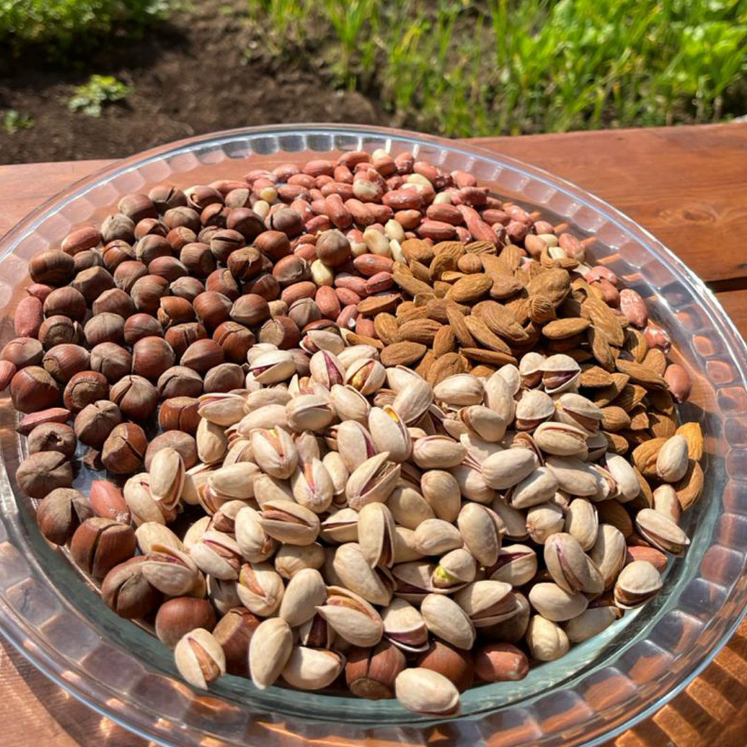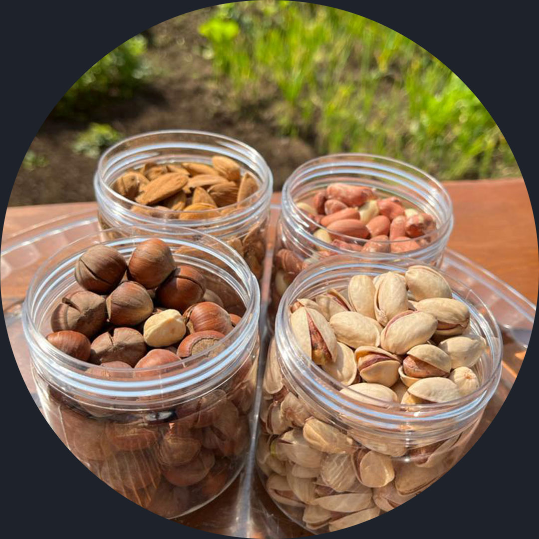 ۱۵۰گرم مغز بادام درختی ایرانی و لذیذ-۱۵۰گرم فندق برشته نمکی ییلاق پرچرب و شیرین-۱۵۰گرم بادام زمینی اعلا محلی-۱۵۰گرم پسته دست چین خندان اعلا